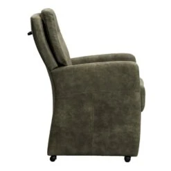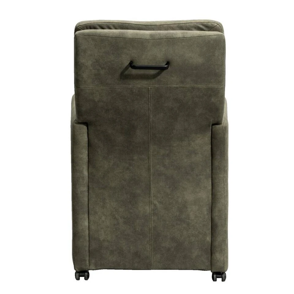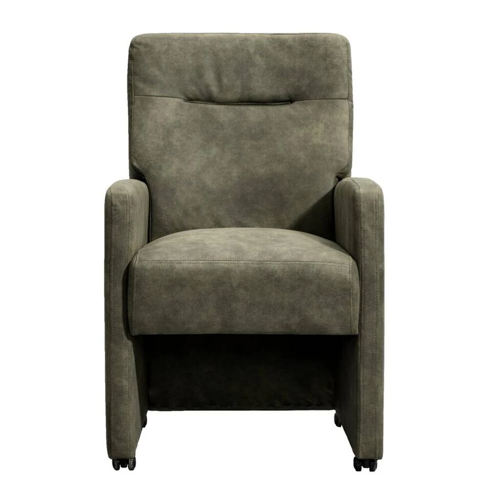Eetkamerstoel Daniel is een stoere zeer comfortabele eetkamerfauteuil. Deze stoel is vervaardigd uit een groen kleurige preston stof. Preston is een zachte stof met een natuurlijk patroon dat lijkt op leder. De comfortabele zitting met armleuningen, de hoge rug en de handige wieltjes zorgen ervoor dat je avonden achter elkaar kan genieten van het (na)tafelen.
