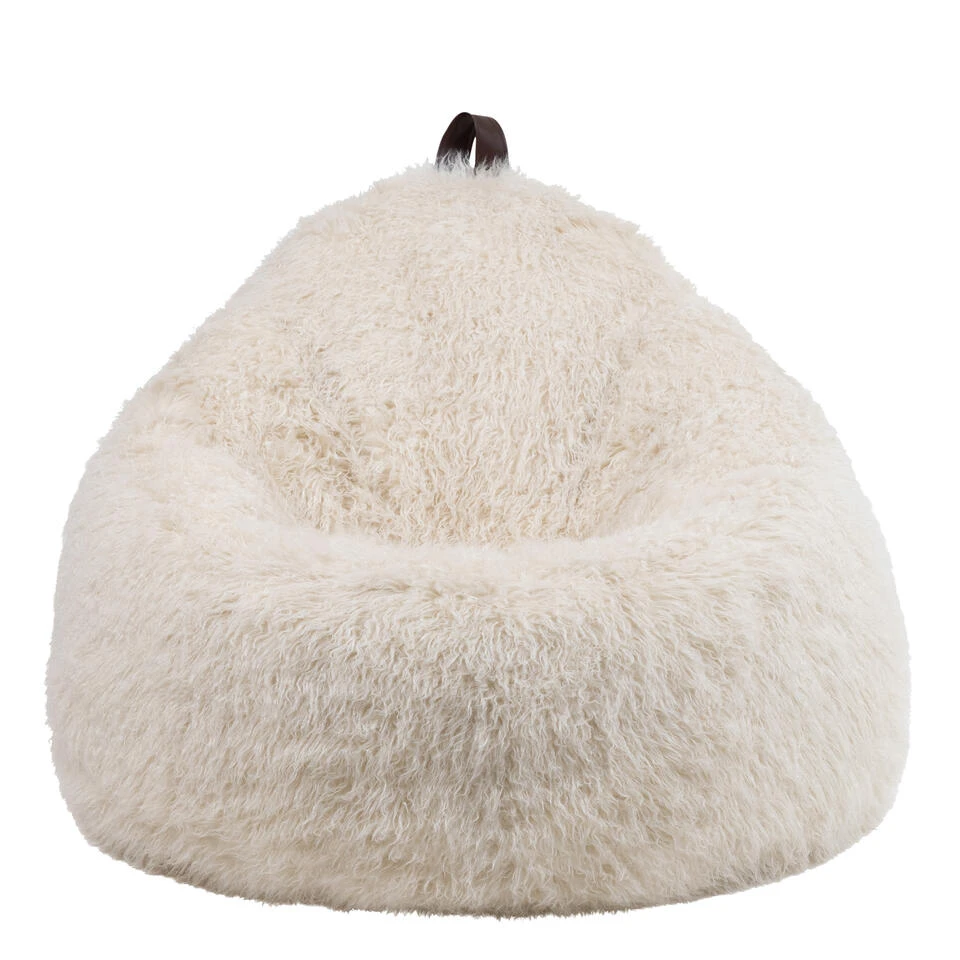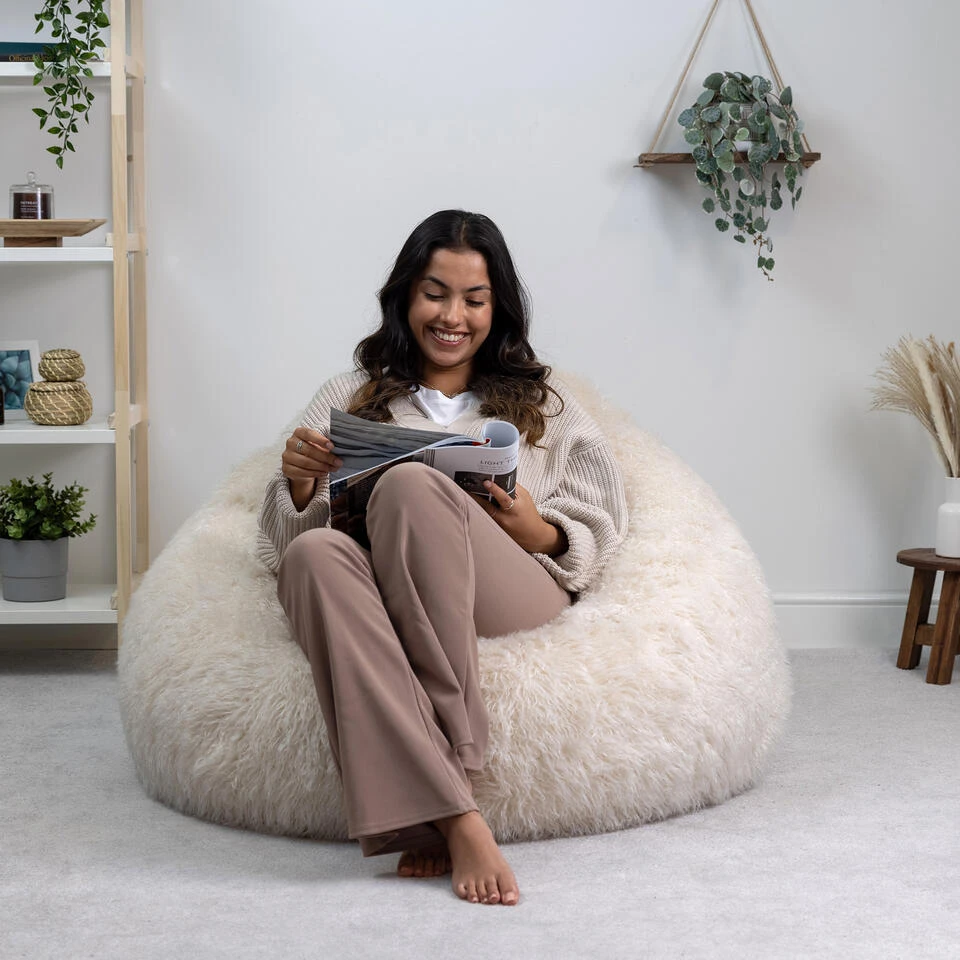 LUXUEUS ZITTEN; De iconische Cocoon-zitzak straalt relaxte charme uit met een textuurrijke bekleding van imitatiebont die zacht en warm aanvoelt.