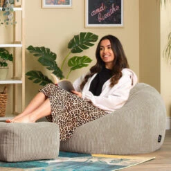 RELAX EN LEUN ACHTEROVER; Deze zitzakzetel is gemaakt om lang in te zitten, vervaardigd van superzacht corduroy en gevuld met precies de juiste hoeveelheid kralen voor een perfect ondersteunend inzakeffect.