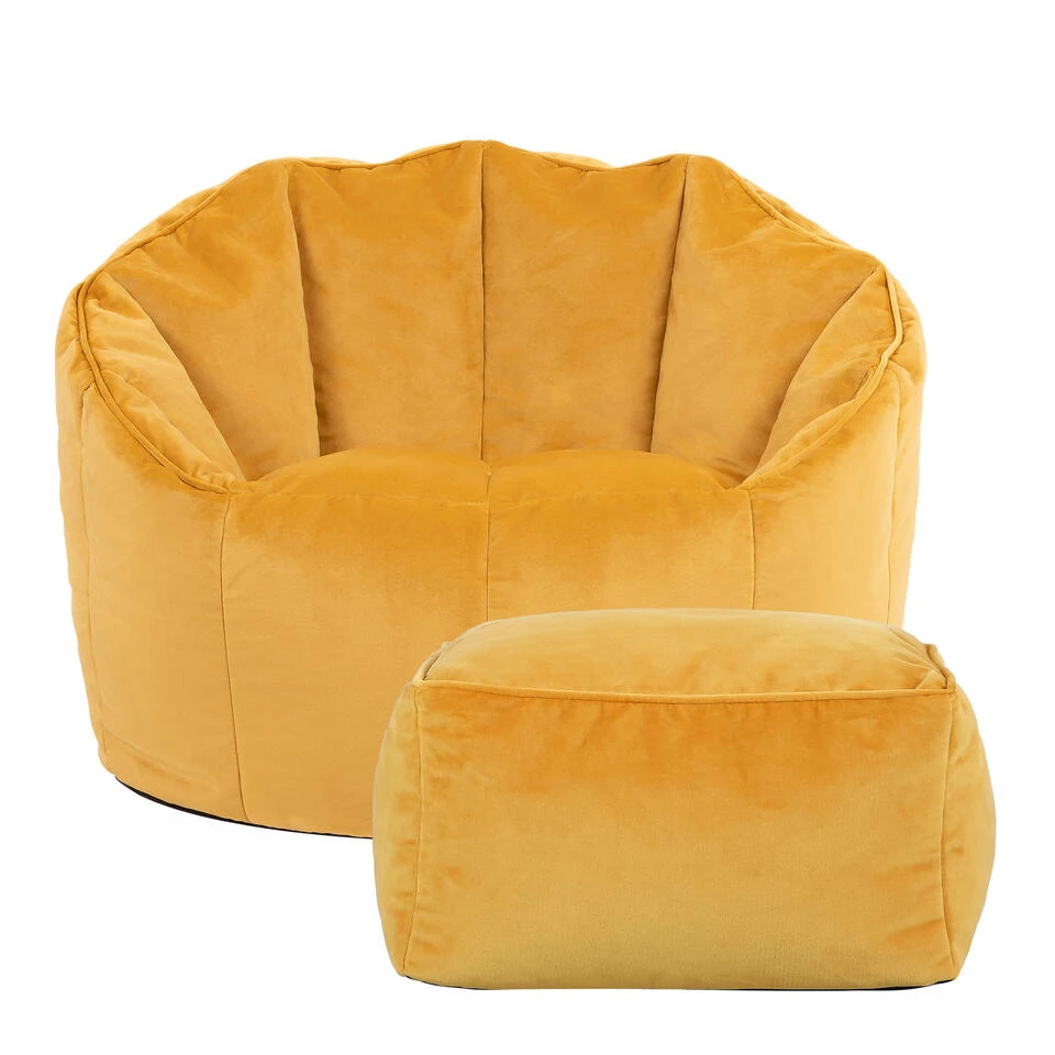 LUXE VOOR ELKE DAG; Een geraffineerde zitzak met hocker die je huis zeker zal verfraaien. De schelpvormige rug en glanzende fluwelen stof dragen bij tot de wow-factor van deze stoel.