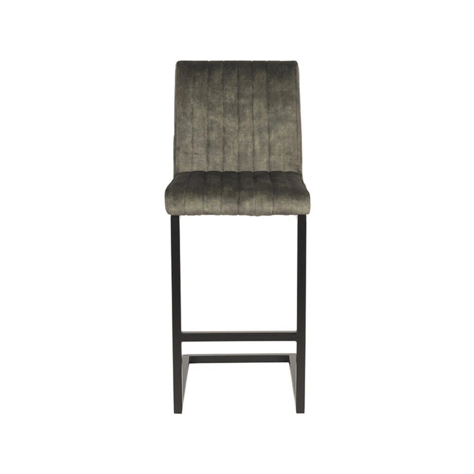 Barkruk Milo, uitgevoerd in een luxe groen kleurige velours heeft een vierkant gevormde zitting voorzien van een luxe stiksel. Het stiksel bestaat uit 8 verticale banen. Het u-vormige metalen frame in de kleur zwart geeft de stoel naast zijn fraaie en elegante uitstraling ook nog eens een bijzonder comfort door de lichte vering in de sledepoot. De poot is voorzien van een extra horizontale pijp waar je je voeten op kunt laten rusten.