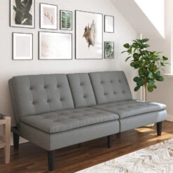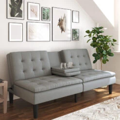 Een functionele slaapbank in retrostijl met een vintage uitstraling. Het is uitgerust met hoogwaardige golfvering. De zitting van de slaapbank is ontworpen voor zowel ontspanning als slaap. Het is goed verend en behoudt zijn elasticiteit permanent. De slaapbank is handmatig verstelbaar met een eenvoudige beweging. De maximale draagcapaciteit per zitplaats is 125 kilogram. De geweven stof is robuust en heeft een fijne textuur.