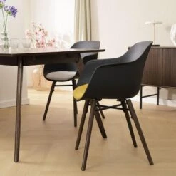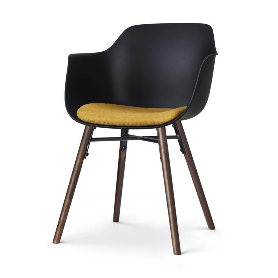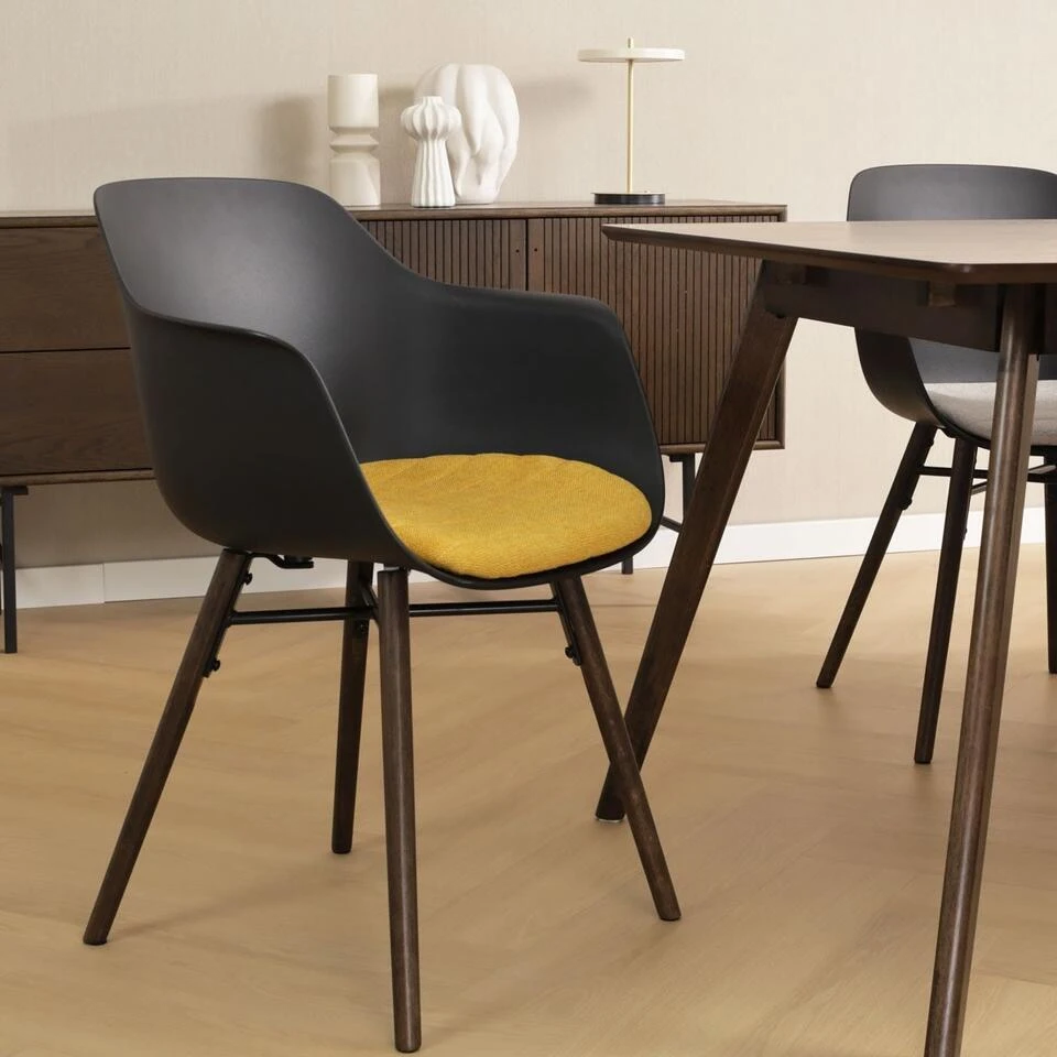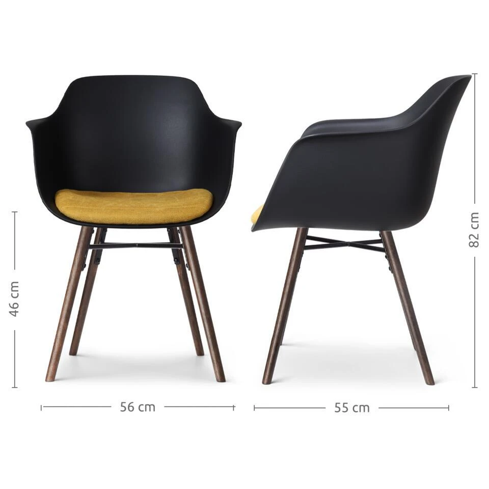 De combinatie van het strakke, eigentijdse ontwerp en de warme walnoot kleur van de houten poten voegt een vleugje elegantie toe aan elke eetkamer. De kunststof zitting van deze kuipstoel is niet alleen duurzaam, maar ook nog eens erg praktisch. Maak je geen zorgen over knoeien of morsen: het gladde oppervlak is gemakkelijk af te nemen met een vochtige doek. De houten poten zijn gemaakt van eikenhout, wat bijdraagt aan de duurzaamheid en stabiliteit van de stoel. Naast de ergonomische vorm van de kunststof zitting is de eetkamerstoel ook ontworpen met armleuningen, zodat je urenlang ontspannen aan tafel kan zitten. Het vaste zitkussen gemaakt van zachte stof tilt het comfort naar een nog hoger niveau en voegt wat zachtheid toe aan het ontwerp. Deze comfortabele kuipstoel is verkrijgbaar in twee verschillende kleuren en met vier kleuren stoelkussens, waardoor je eenvoudig de perfecte combinatie kunt vinden die past bij jouw persoonlijke stijl.